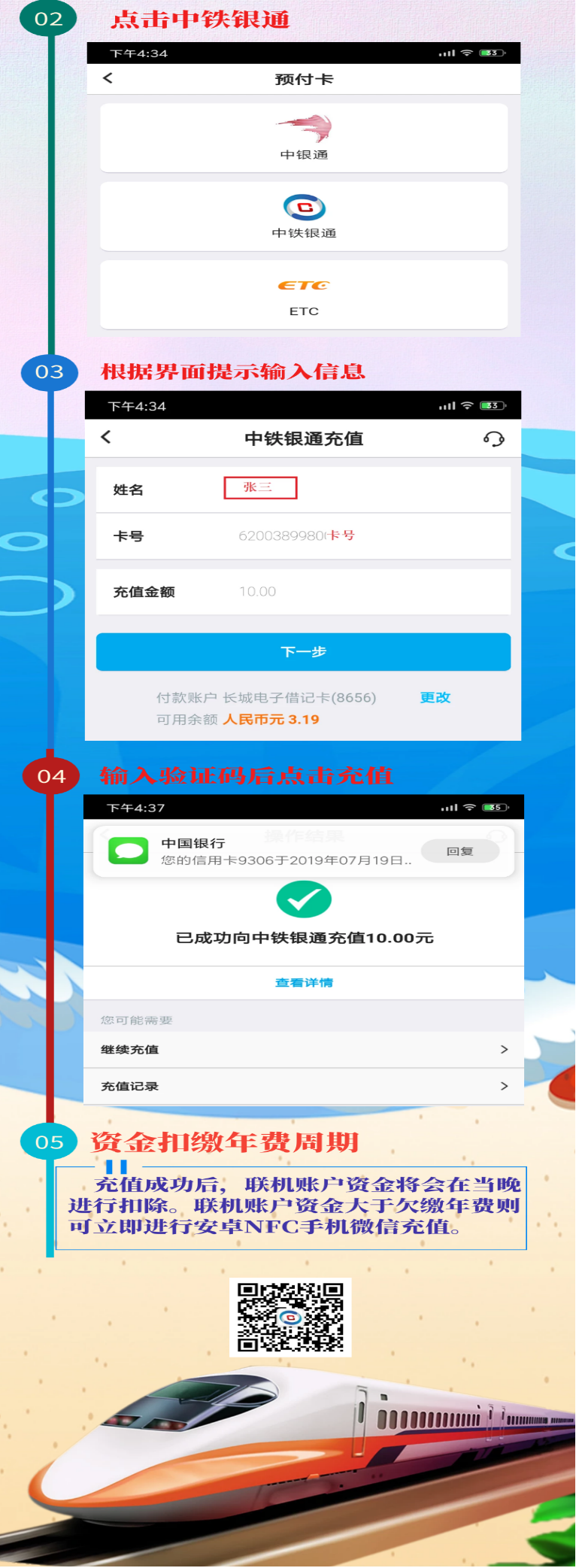 優(yōu)勢(shì):補(bǔ)繳年費(fèi)后可立即對(duì)中鐵銀通卡電子現(xiàn)金(刷卡乘車賬戶)圈存。